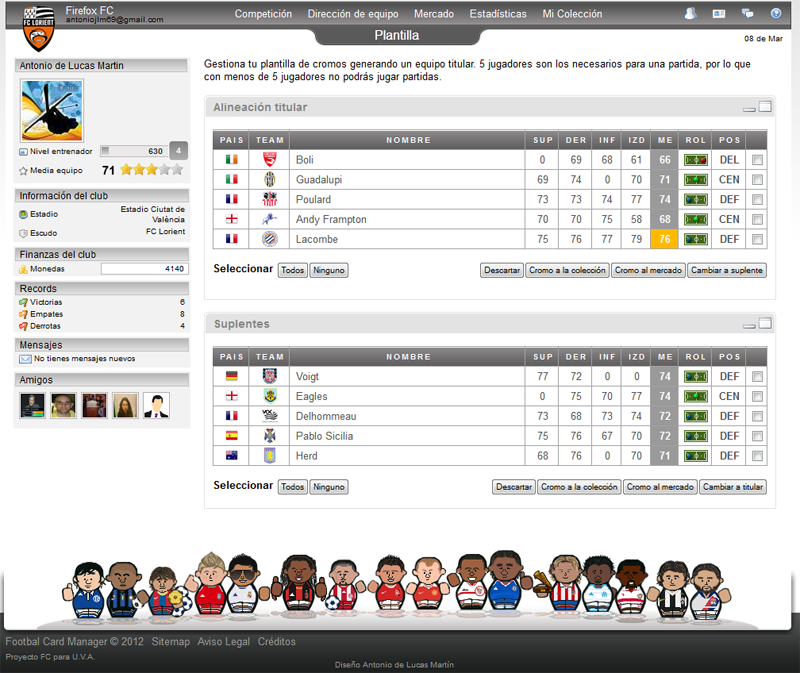 Mis funciones en el proyecto: Diseño de interfaces, comunicación entre usuarios, programación POO php (web) y Java EE (backend), diseño de la BD, creación de los ficheros maestros (cromos), arte y documentación.